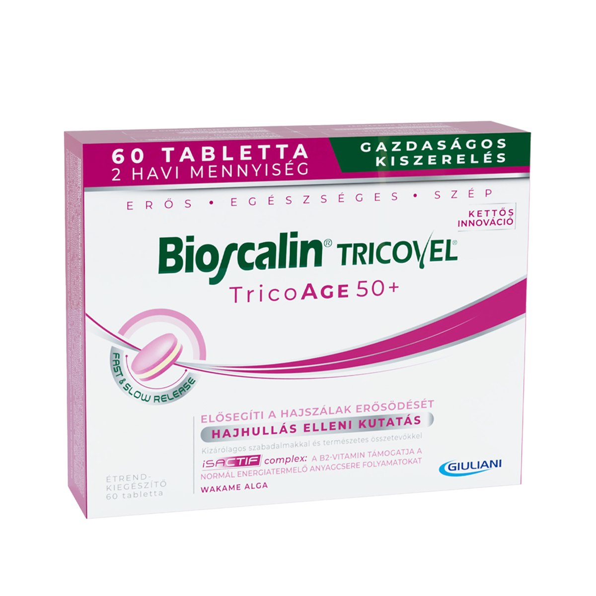 A Bioscalin® TRICOVEL TricoAGE 50+ étrend-kiegészítőt a Giuliani hajhullást kutató laboratóriuma kifejezetten a haj táplálásáért és szépségéért fejlesztette ki, hogy a haj energiatermelő anyagcsere-folyamatokhoz (riboflavin) és fontos tápanyagokhoz (cink) jusson. Emellett D-vitaminnal és izoflavon forrást jelentő szójával gazdagították az összetételt, ezáltal is elősegítve a hajszálak erősödését.