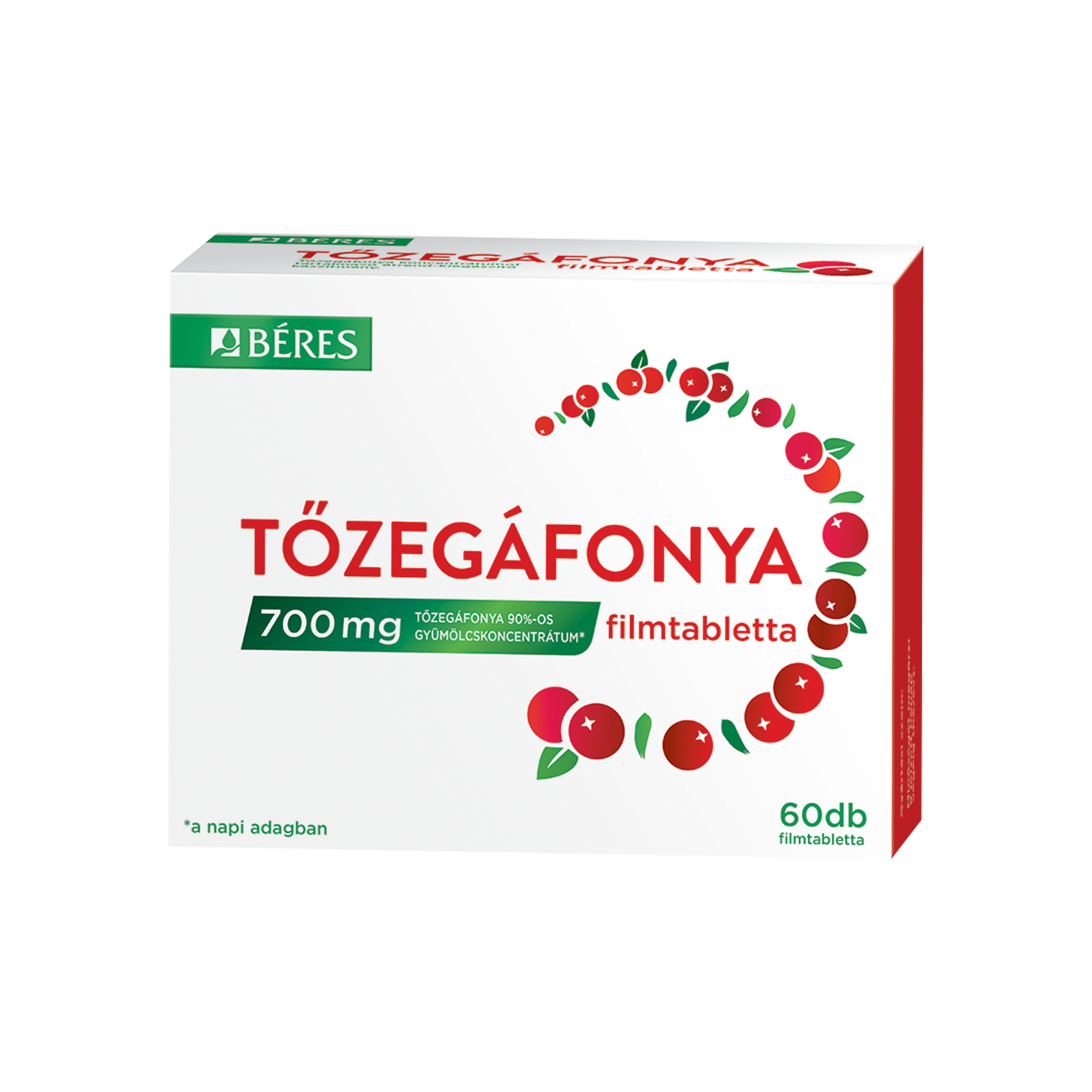 700 mg Tőzegáfonya gyümölcs 90%-os koncentrátum a napi adagban.