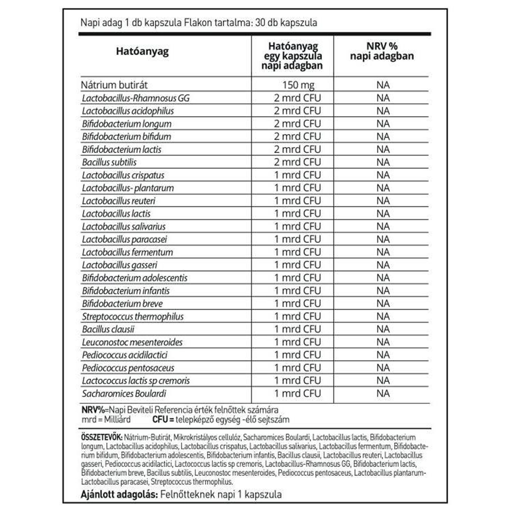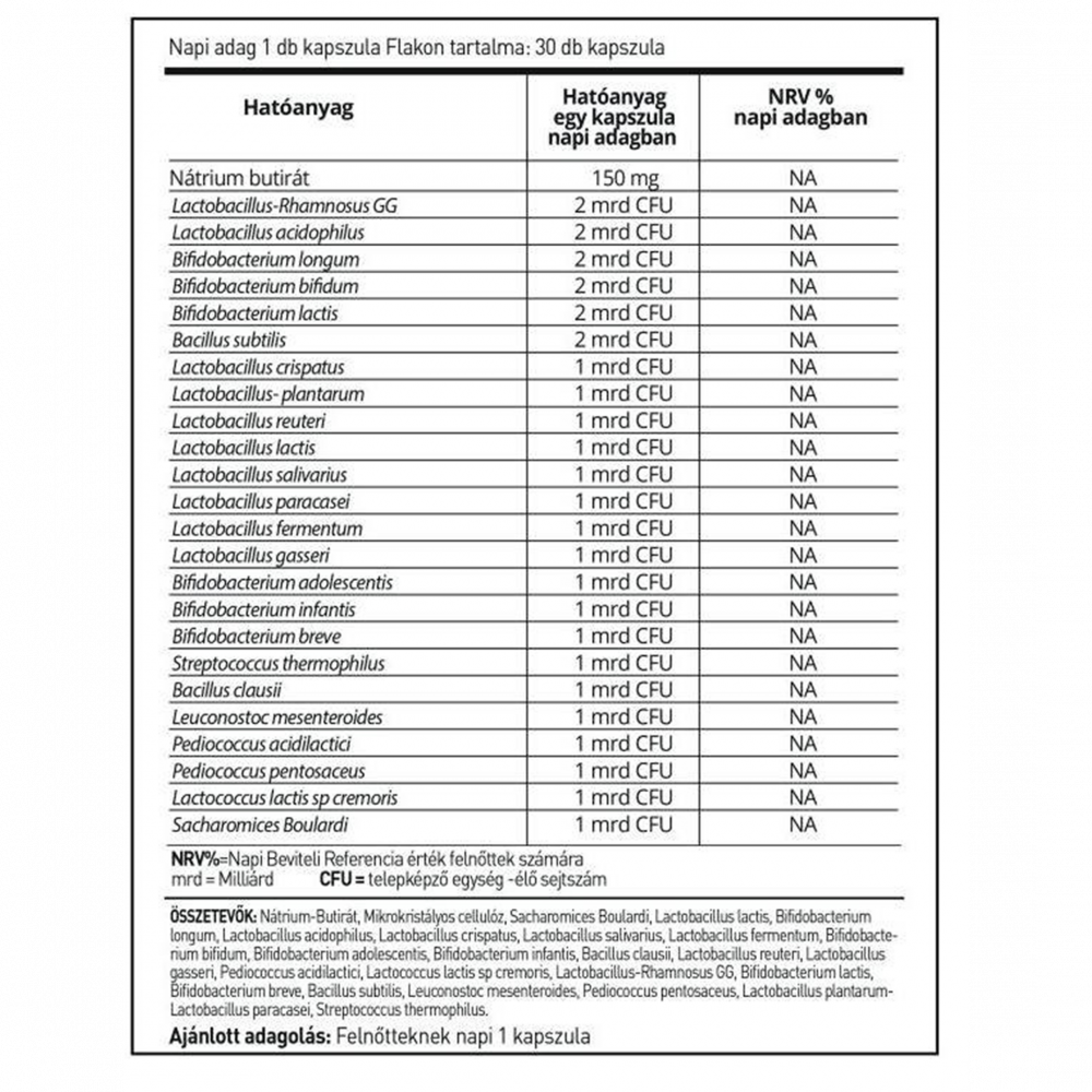 Nátrium-Butirát, Mikrokristályos cellulóz, Sacharomices Boulardi, Lactobacillus lactis, Bifidobacterium longum, Lactobacillus acidophilus, Lactobacillus crispatus, Lactobacillus salivarius, Lactobacillus fermentum, Bifidobacterium bifidum, Bifidobacterium adeloscentis, Bifidobacterium infantis, Bacillus clausii, Lactobacillus reuteri, Lactobacillus gasseri, Pediococcus acidalactici, Lactococcus lactis sp cremoris, Lactobacillus-Rhamnosus GG, Bifidobacterium lactis, Bifidobacterium breve, Bacillus subtilis, Leuconostoc mesenteroides, Pediococcus pentosaceus, Lactobacillus plantarum, Lactobacillus paracasei, Streptococcus thermophilus.