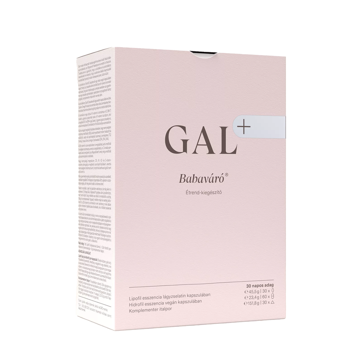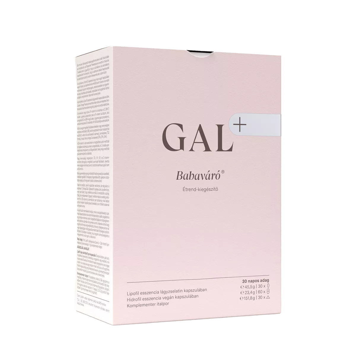 Összetevők: GAL+ Babaváró® Lipofil esszencia lágyzselatin kapszulák (30 db): halolaj-koncentrátum, D-alfa-tokoferol és vegyes tokoferolok, magas karotinoid- és tokotrienol-tartalmú, MSPO-minősített vöröspálma- gyümölcs-kivonat, 2% menakinon-7-tartalmú olívaolaj, 2,5% kolekalciferol-tartalmú MCT-olaj, görög zsálya-kivonat, retinil-palmitát, fillokinon; kapszulahéj (zselatin, nedvesítőszer: glicerin, víz, karamell, édesítőszer: szteviol-glikozidok sztívialevél-kivonatból, kristályvanillin).